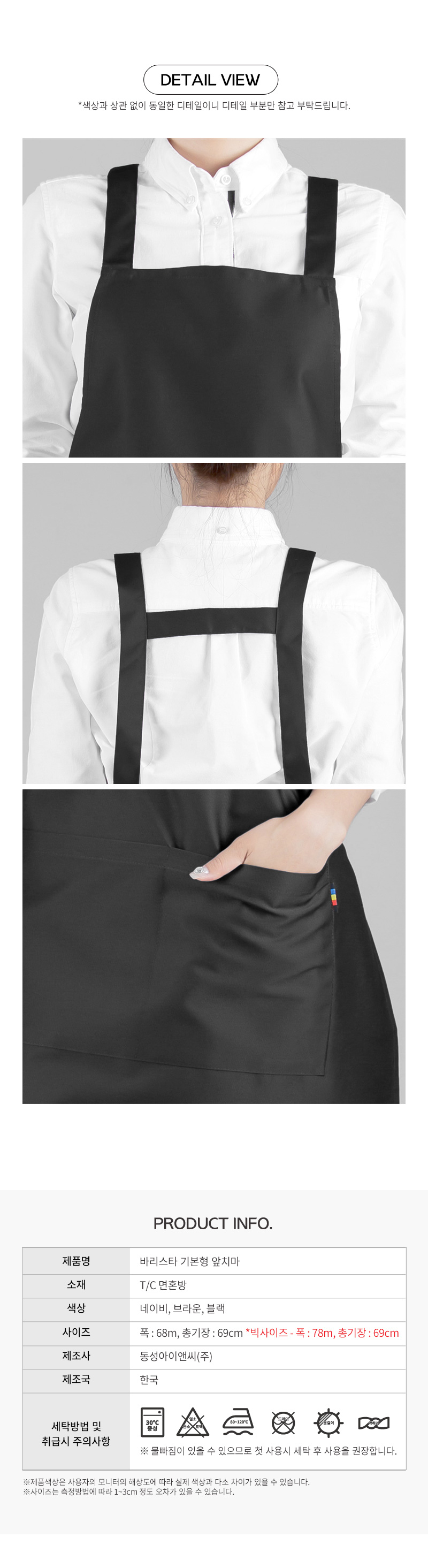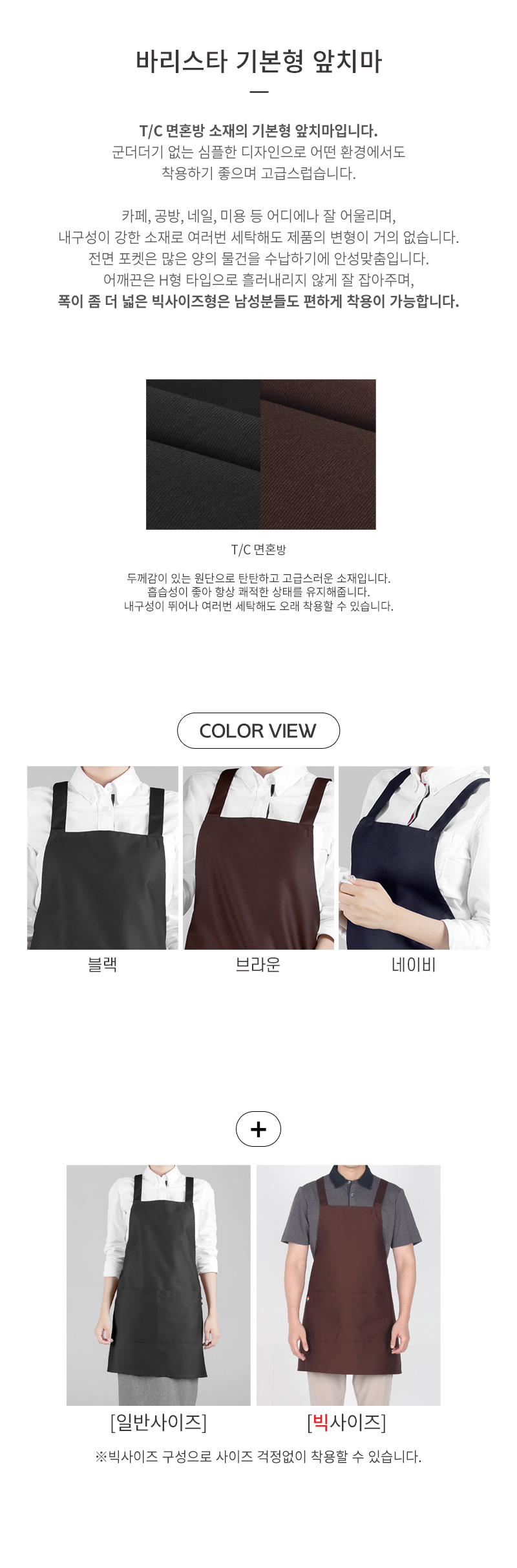 T/C 면혼방 소재의 기본형 앞치마, 바리스타,공방,미술,네일샵용 등으로 다양하게 입을 수 있습니다.