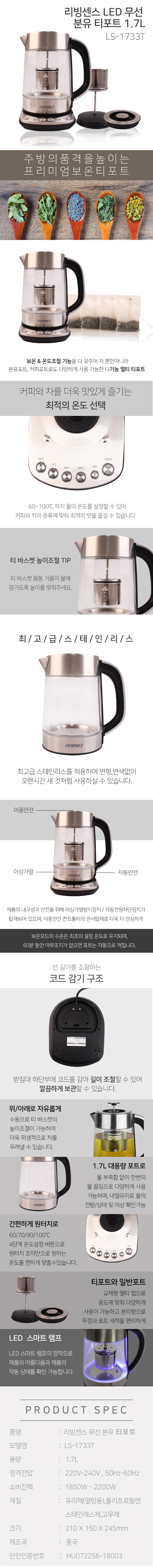 리빙센스 LED 무선 분유 티포트 1.7L (LS-1733T)