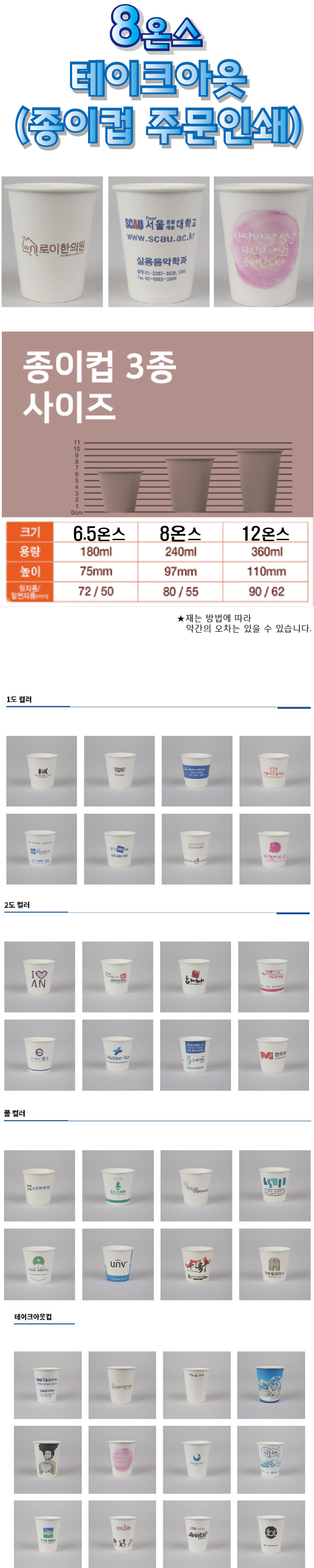• ★ 8온스 300g 평량 국내산천연펄프지 수지인쇄 ★ 1,000개 (1박스부터 인쇄주문제작가능!) ★ 인쇄비, 기본택배비포함, - 도서산간 제외