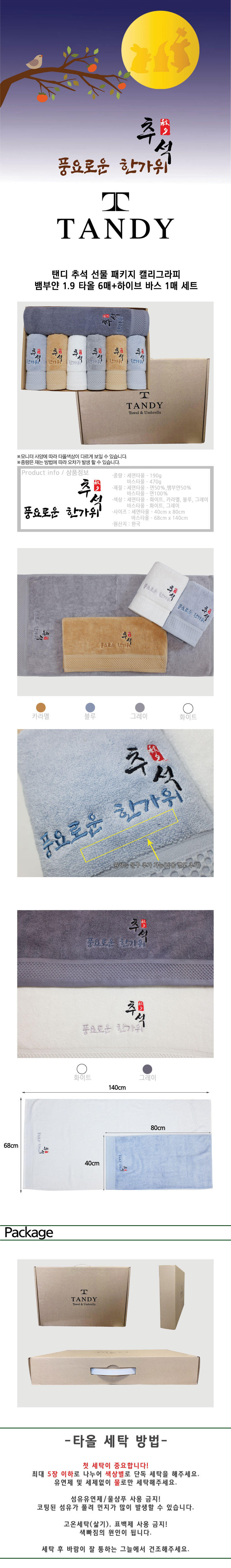 탠디 추석선물패키지 캘리그라피 뱀부얀 1.9 타올 6매 하이브 바스타올 1매 종합세트