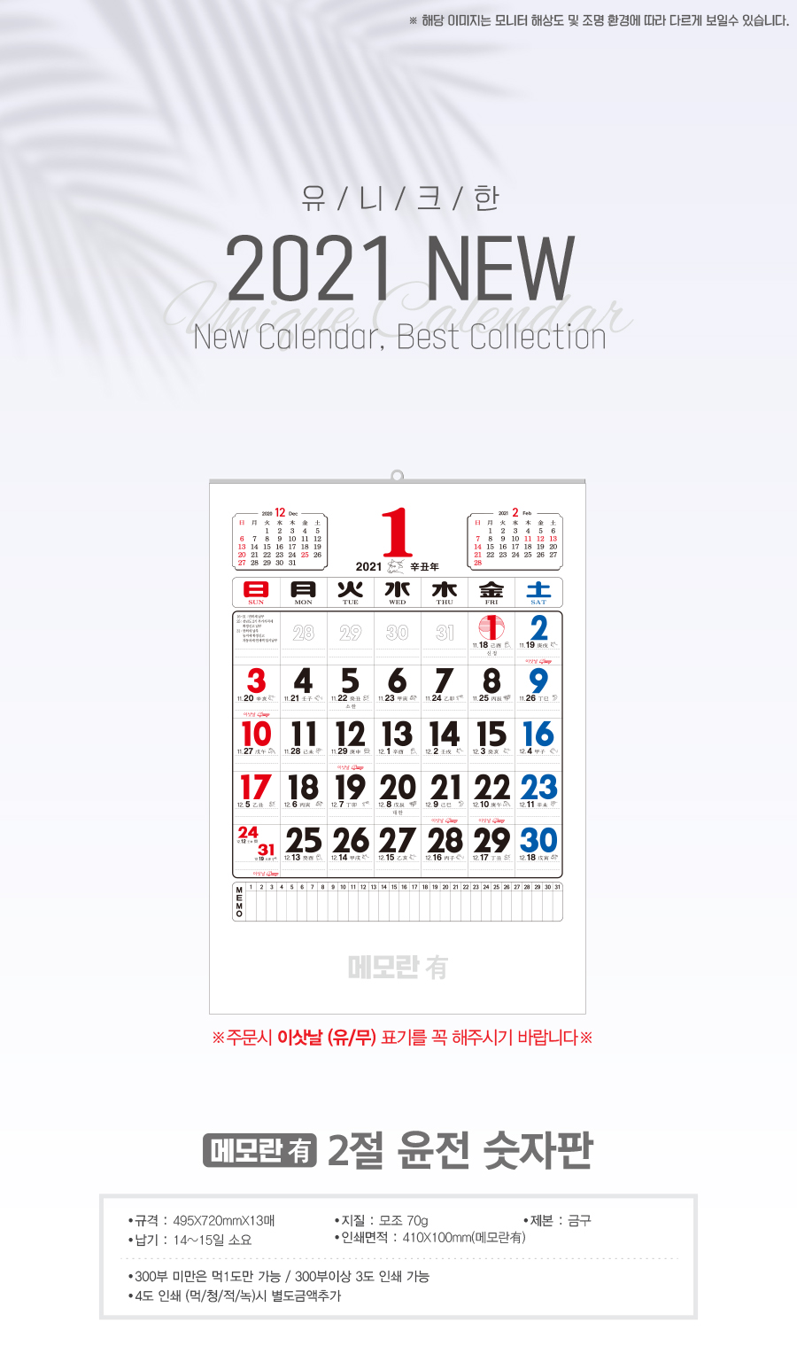 2절 윤전숫자판 달력(모조지 70g) 메모란有
